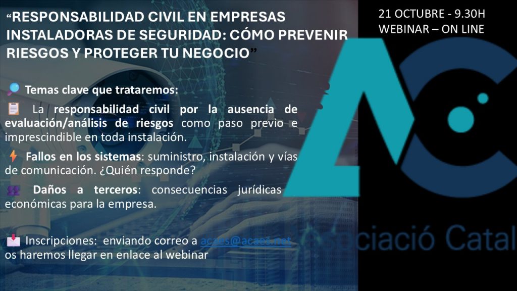 ACAES organizó el Webinar relativo a la responsabilidad civil de las empresas instaladoras de seguridad. Con un éxito absoluto de participación, durante el webinar pudimos aprender como hacer frente a la responsabilidad en la que pueden incurrir las empresas instaladoras de sistemas de seguridad y las Cra, analizando, de la mano de nuestro asesor jurídico, las incidencias más comunes y las recomendaciones para cubrir dicha responsabilidad.