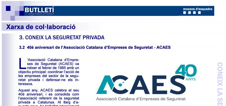 Artículo publicado en el «Butlletí de Seguretat Privada», editado por Mossos d’Esquadra, sobre el 40º aniversario de ACAES.